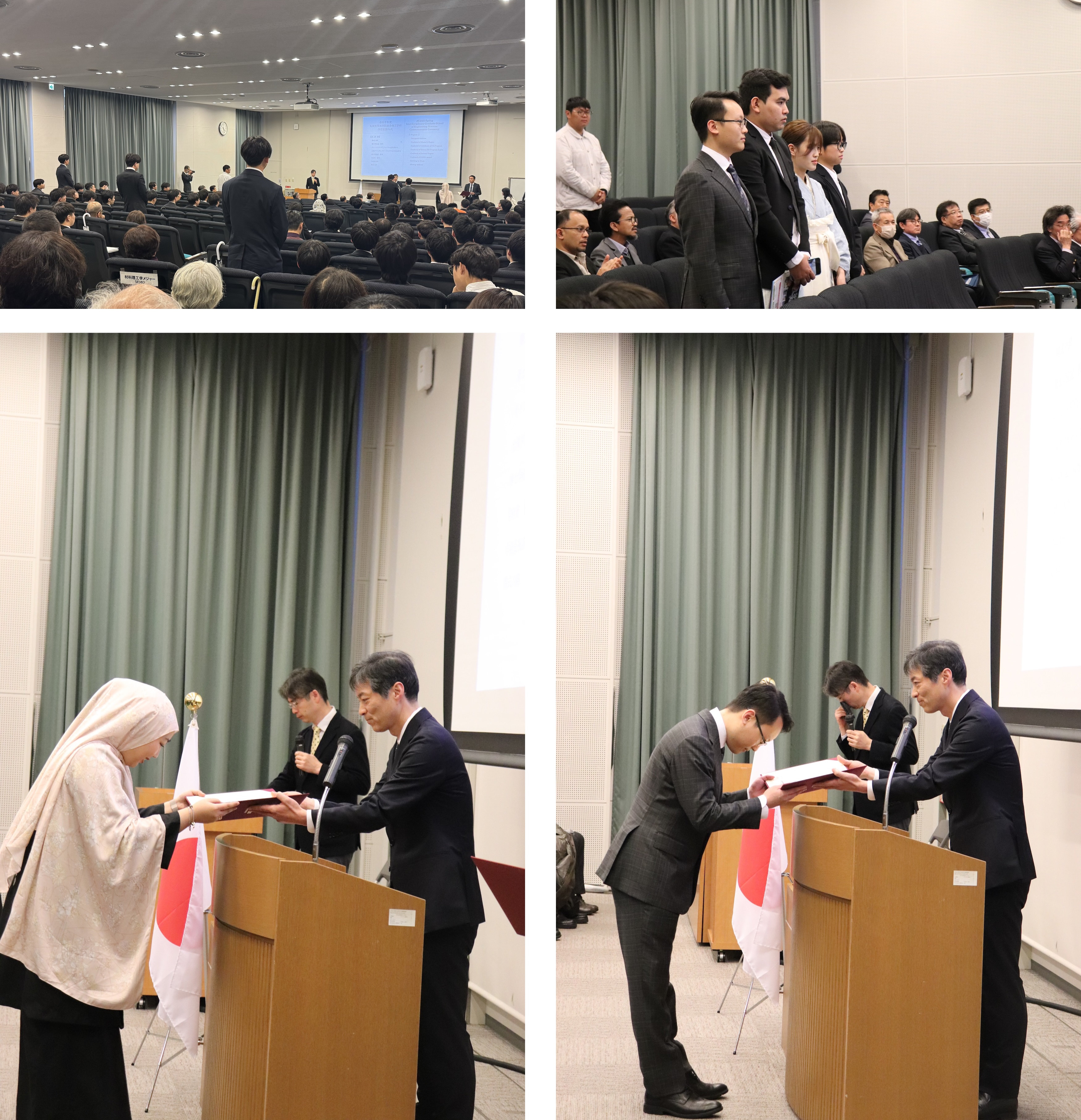 本年度は、CAダブルディグリープログラム留学生の4名の代表として、マレーシア工科大学からの留学生、および台湾ダブルディグリー3名の代表として台湾師範大学からの留学生が総代として学位記を授与しました。式典では、伊藤学府長より、3大学の総長が署名したダブルディグリー取得証明書と学位記が読み上げられ、授与されました。