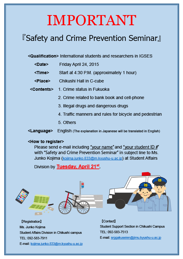 Please be informed that we are having “Safety and Crime Prevention Seminar for International Students” by Fukuoka prefectural police department and Kasuga police station. In this seminar, the useful Japanese culture and custom will be taught and explained the things you should know to prevent from committing crimes and being involved in accidents. Do not miss this opportunity to learn very valuable information for international students. This seminar is not mandatory, but please participate in this seminar to protect yourself. This seminar is not only for new international students, all the international students in IGSES are welcome.