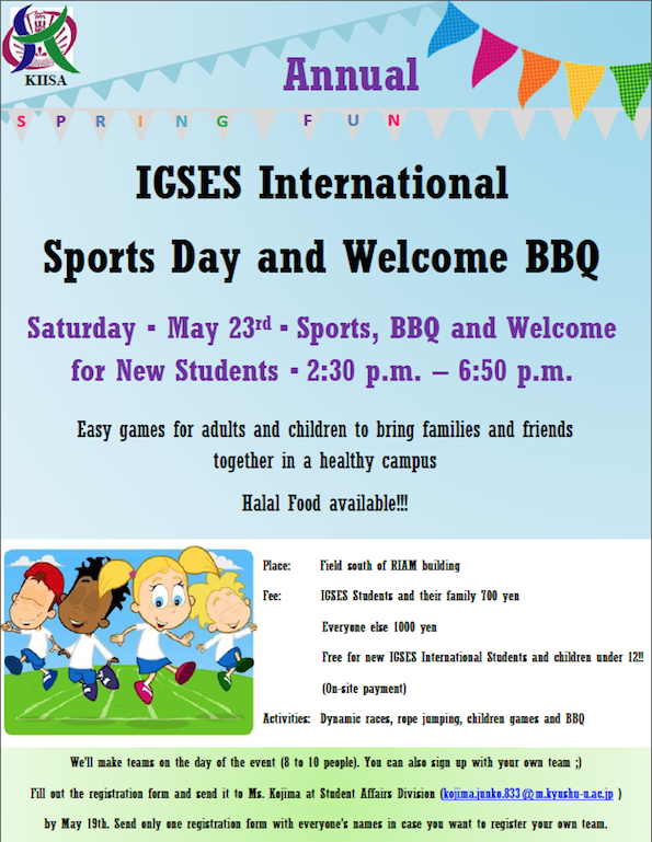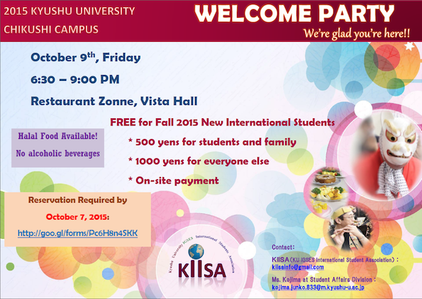 This party will be hosted by Kyushu University IGSES International Students Association (KIISA) to welcome the new students and to promote amity among int'l students and Japanese students and also faculty member in Chikushi Campus. The party will be held as below, and everyone is welcome to attend!