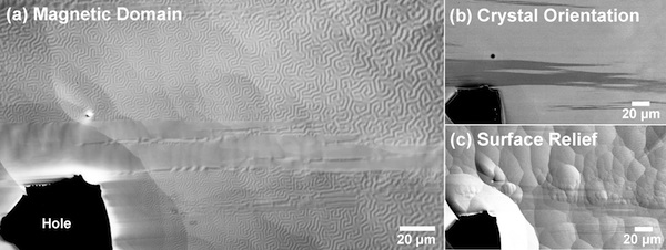 走査電子顕微鏡によって可視化されたFe-Pt合金の磁区構造(a), 結晶方位(b), 表面起伏(c)。 |