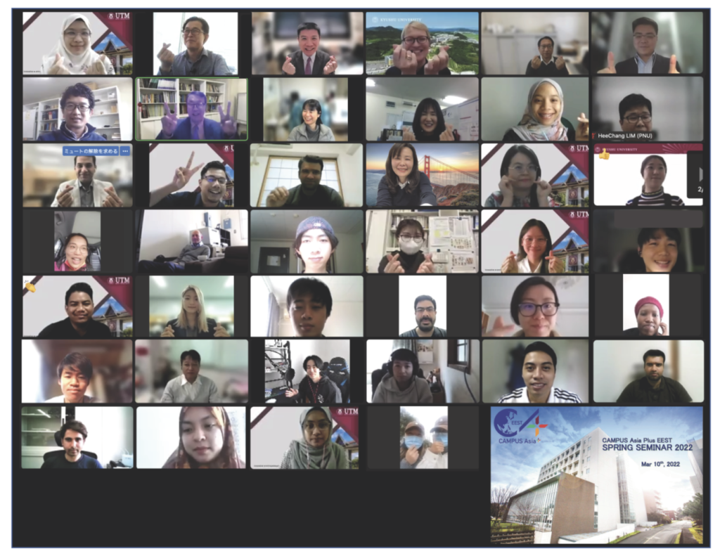 3月10日に、スプリングセミナーがオンラインにて開催され、KUから14名、PNUから3名、SJTUから12名、今年から協働校として加わるUTM(マレーシア工科大学)からは10名の学生が参加しました。