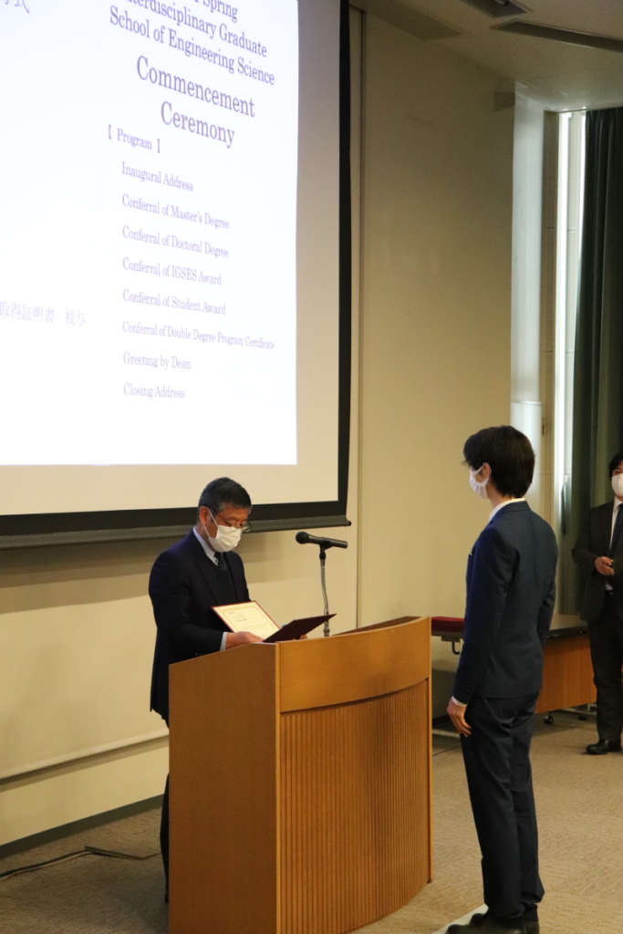 上海や釜山との往来も引き続き叶わないため、CAダブルディグリー生代表として九大から1名のみ出席し、中島学府長より3大学総長がサインしたダブルディグリー取得証明書と、EESTコース修了証が読み上げられ授与されました。