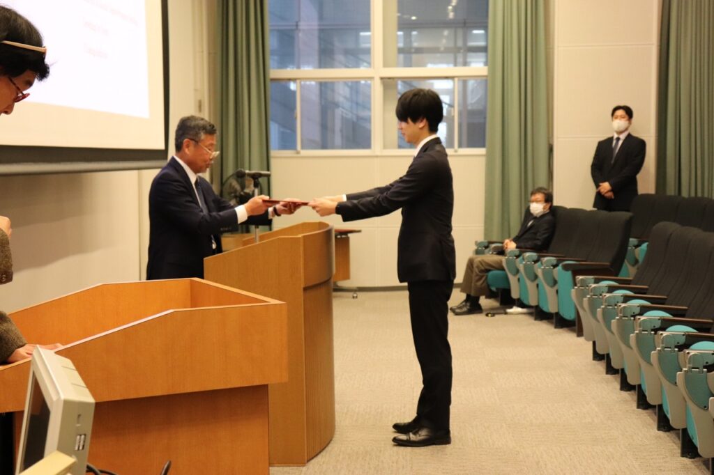 CAダブルディグリー生代表として釜山大学校に派遣した学生1名と台湾科技大学に初めて派遣した学生1名が出席し、中島学府長より3大学総長がサインしたダブルディグリー取得証明書と、NTUST派遣学生へはダブルディグリーコース修了証が読み上げられ授与されました。